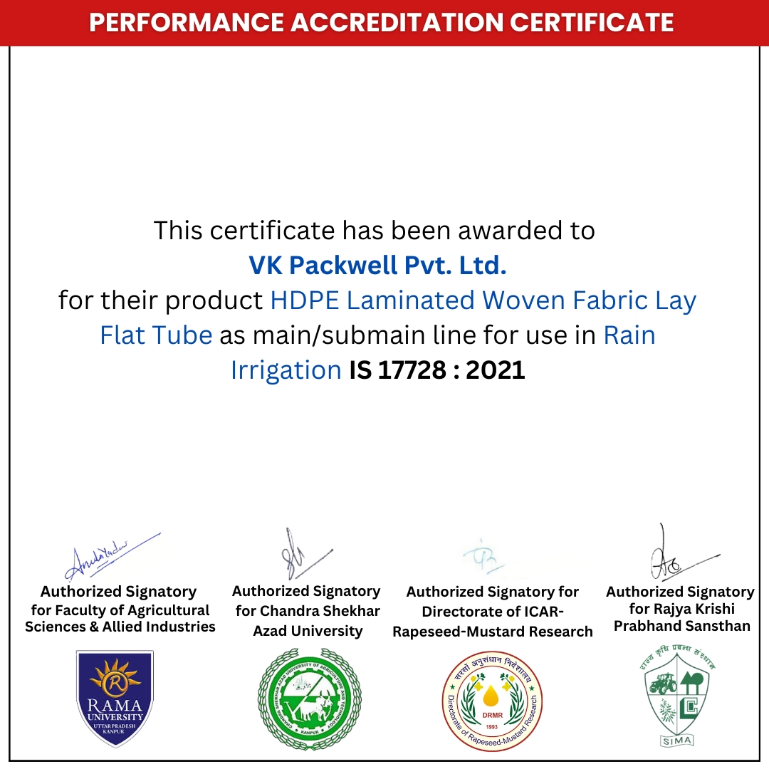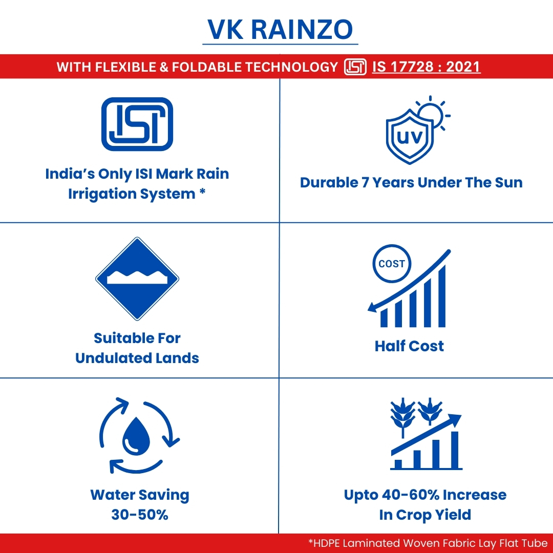 V.K. Rain Pipe irrigation method is a substitute for sprinkler irrigation which sprays the same quality of water to crops. It is made of HDPE fabric (High-Density Polyethylene ). V.K. Rain Pipe has zig-zag & randomly punched holes by laser system which results in the best water sprouts performance in this category. No clogging problem arises in V.K. Rain Pipe. It has more life than any other ordinary rain pipe. V.K. Rain Pipe is very easy to assemble and reallocate. It helps to reduce the consumption of energy and water by more than 50 percent. With the help of appropriate water pressure, V.K. Rain Pipe can spray up to 10 to 15 feet on both sides. To perform best, V.K. Rain Pipe required 2 kg. water pressure. It is very durable, easy to carry around and flexible products for farmers.
